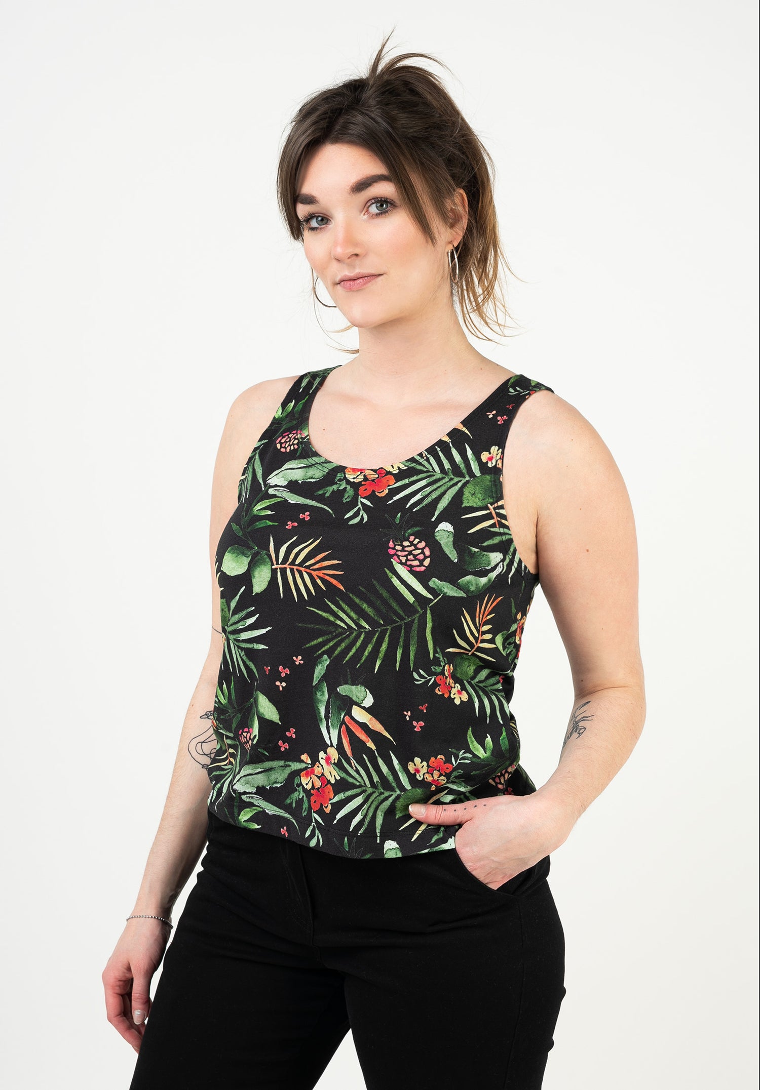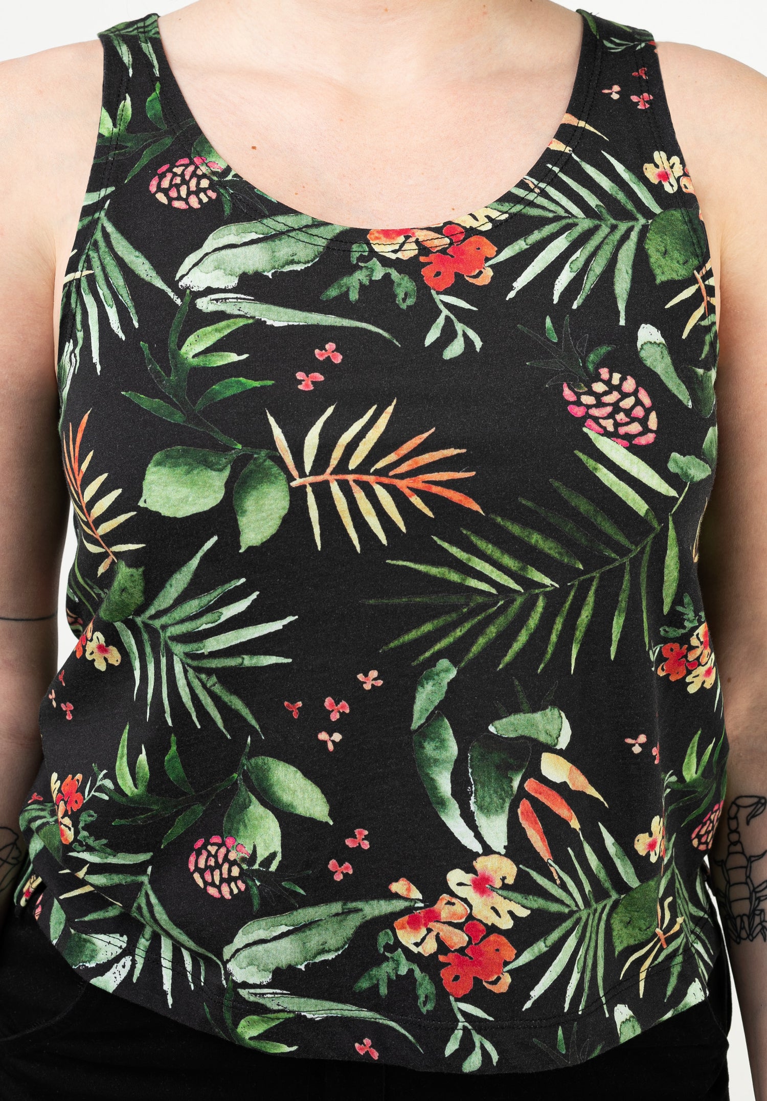 Mit dem Forvert Nielson Top kann der Sommer nicht schnell genug kommen. Der tropische Allover-Print und der gekürzte Schnitt versprechen, dass du mit diesem Teil auf jeder Beachparty der Mittelpunkt bist.