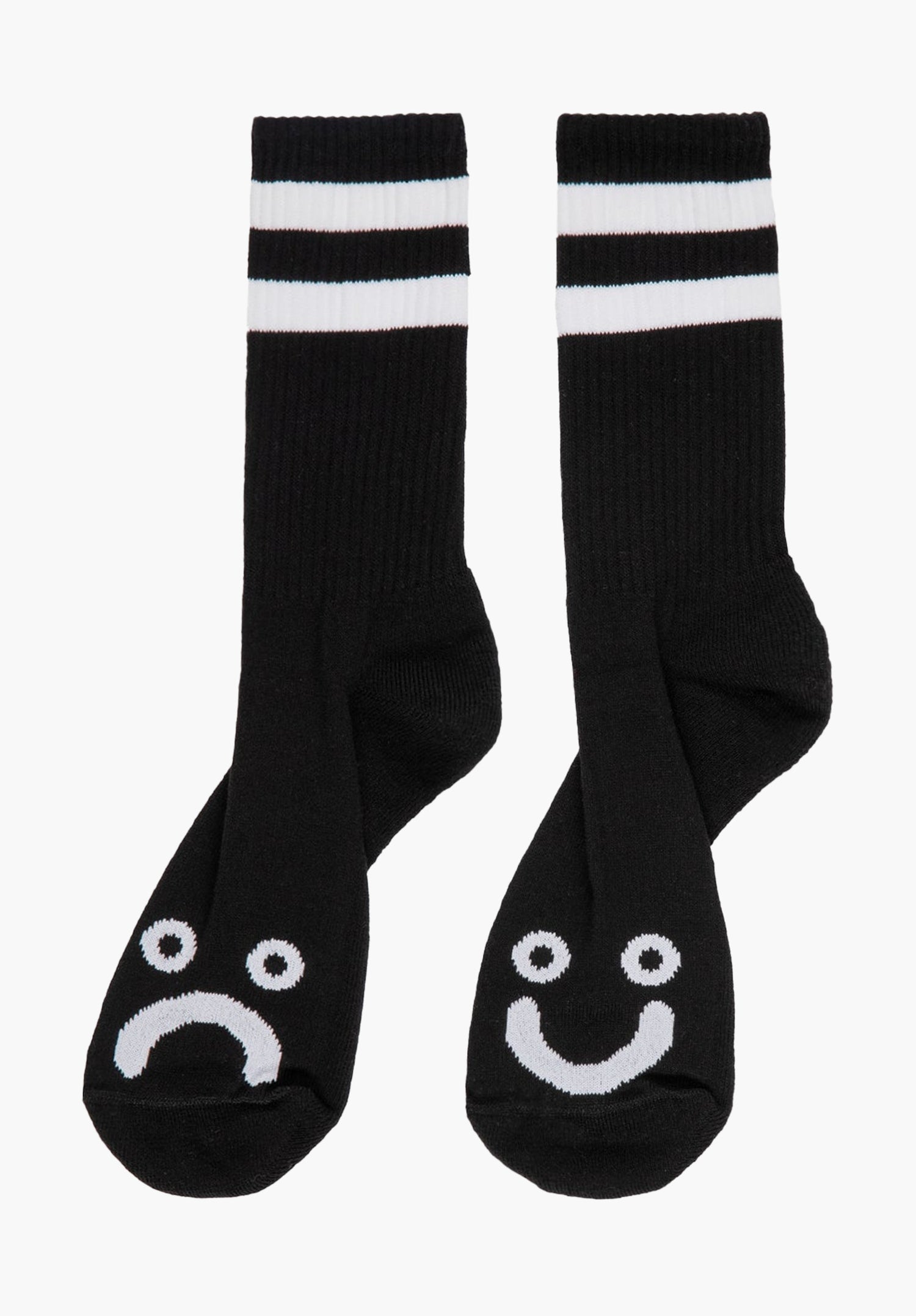 In puncto Design geht's am Schaft der Polar Skate Co Happy Sad Classic Socks mit zwei kontrastfarbenen Streifen recht klassisch zu, dafür wurde der Bereich knapp über den Zehen mit zwei Stimmungsbildern ausgestattet. Die Zuordnung darüber, welcher Fuß nun "happy" und welcher "sad" ist, bleibt dabei dir überlassen - stylisch sind die Dinger sowieso und zwar völlig unabhängig von der gewählten Variante.