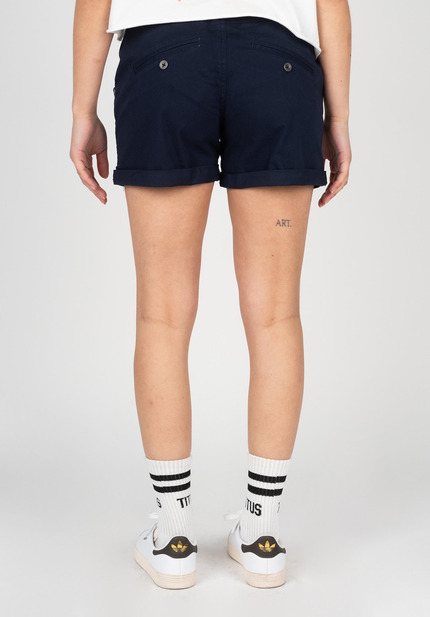 - zwei eingelassene Gesäßtaschen mit Knöpfen