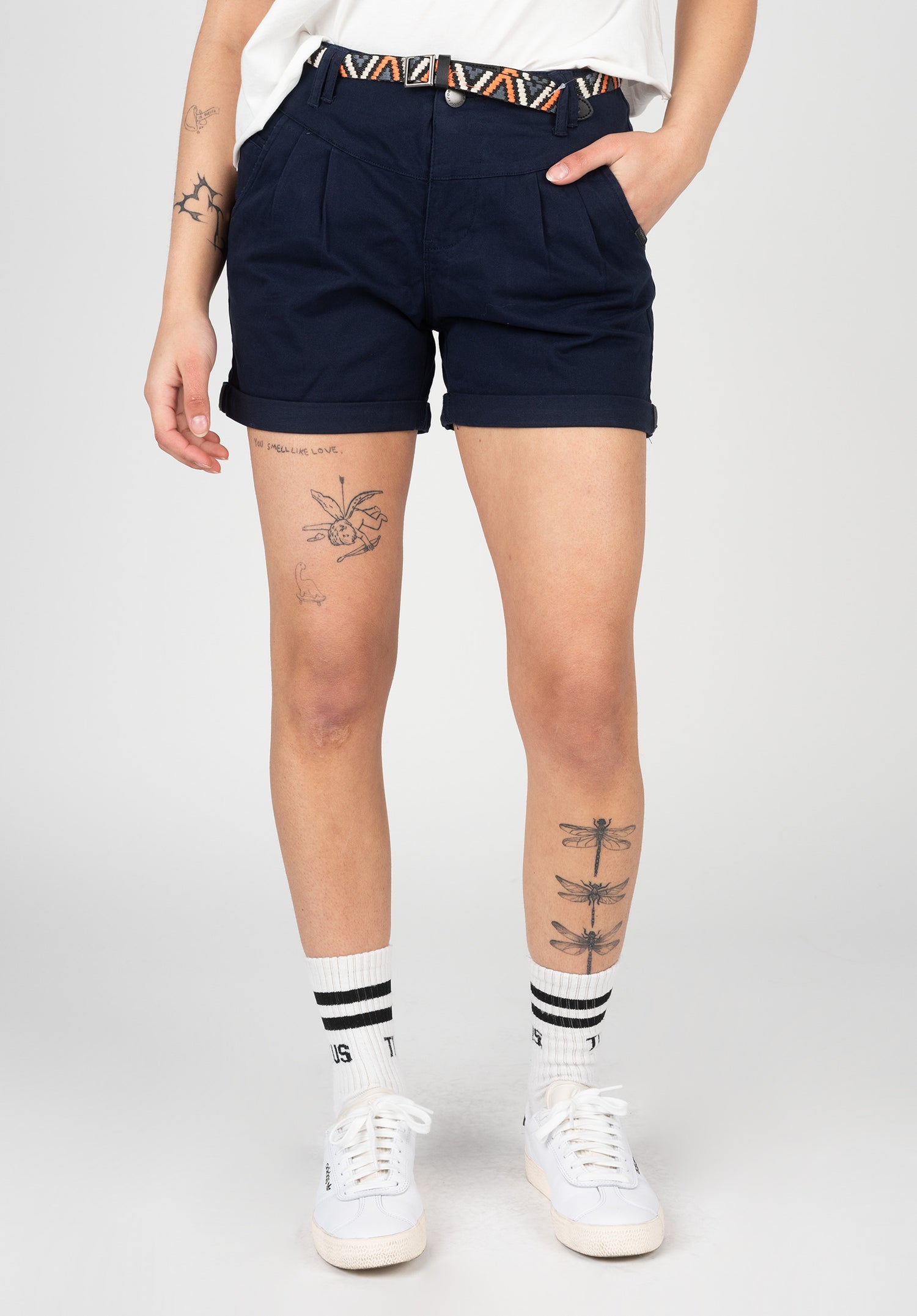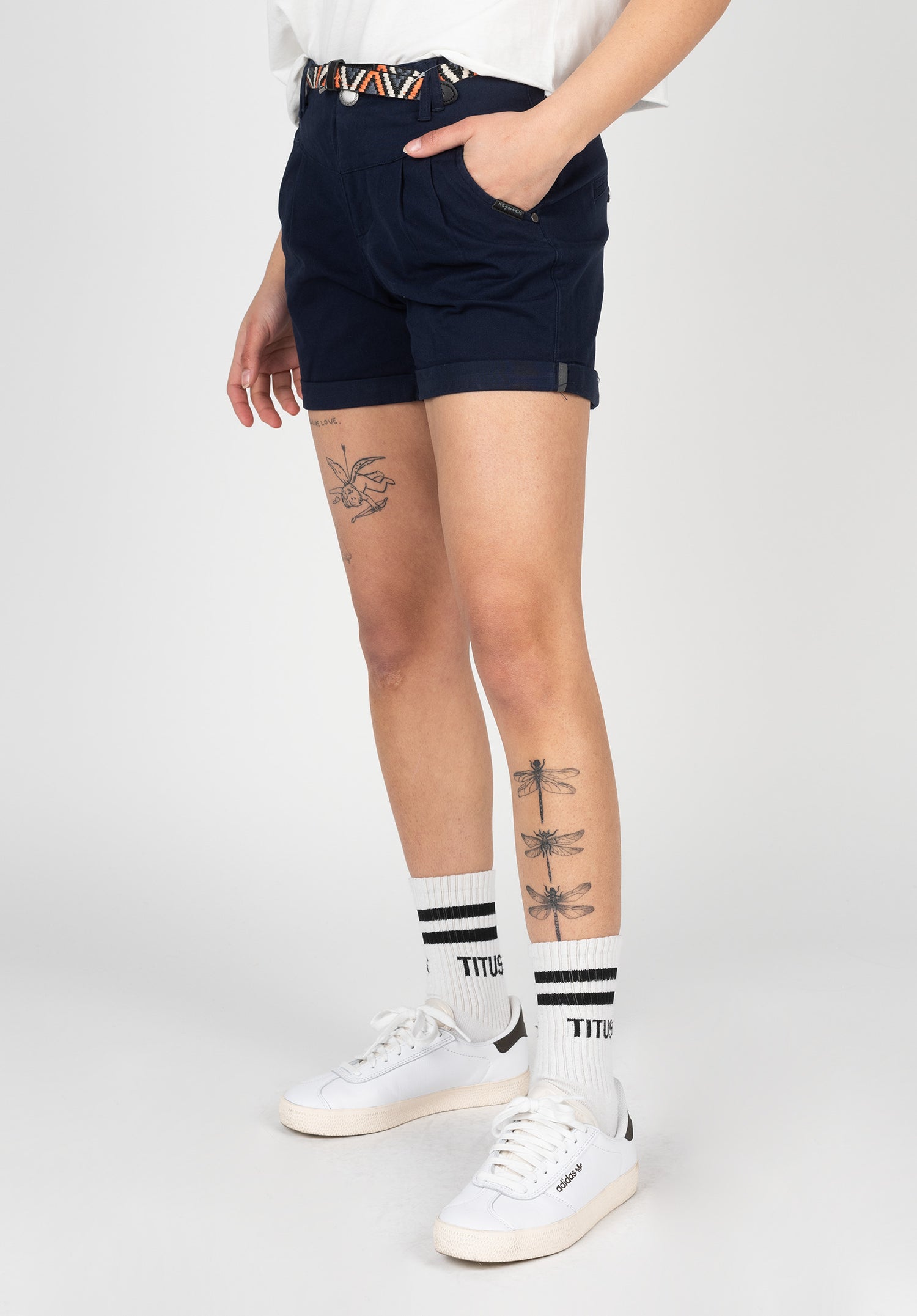 Mit der Ragwear Heeven B Shorts bist du zukünftig mit einem körpernahen Schnitt, welcher mit Bundfalten, geknöpften Pockets und gekrempelten Beinabschlüssen das Maximum aus einer Sommershorts holt unterwegs. On Top kommt ein Flechtgürtel, wodurch die Shorts einen femininen Touch erhält.