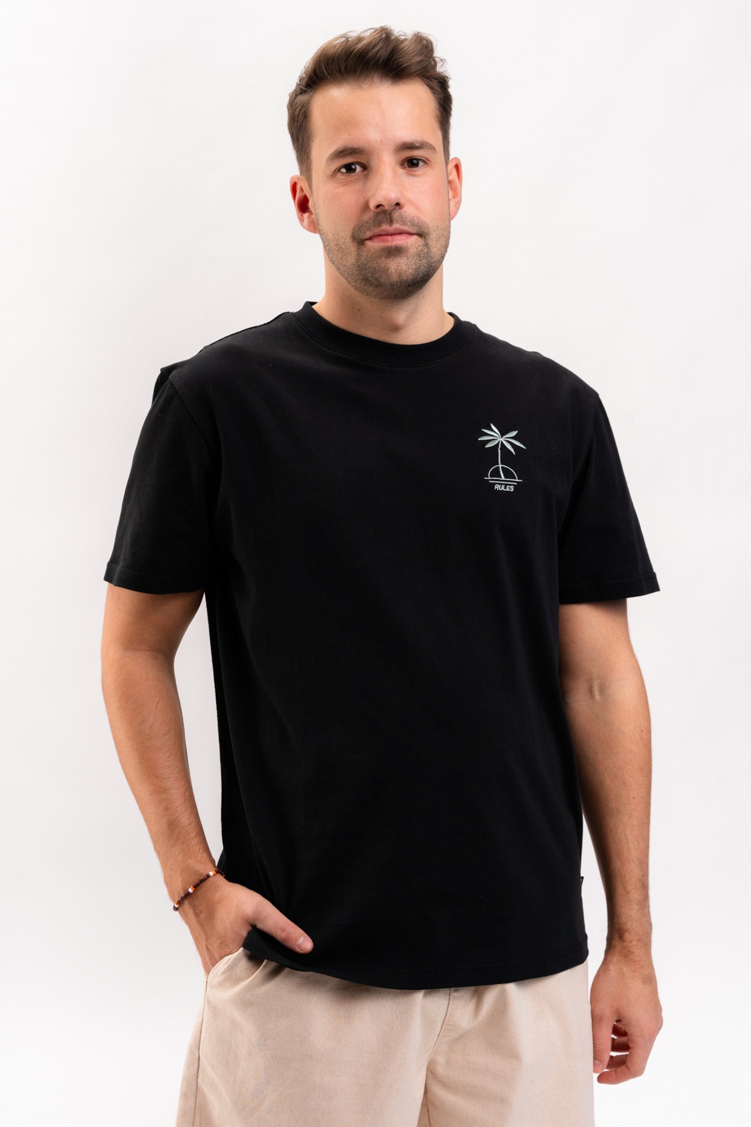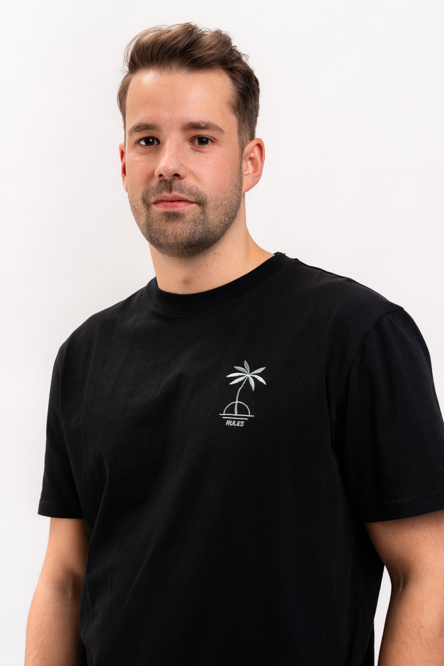 Das Palma Tee von Rules spendet mit einem minimalistischen Sonnenuntergang unter Palmen reichlich Wärme und positive Vibes.